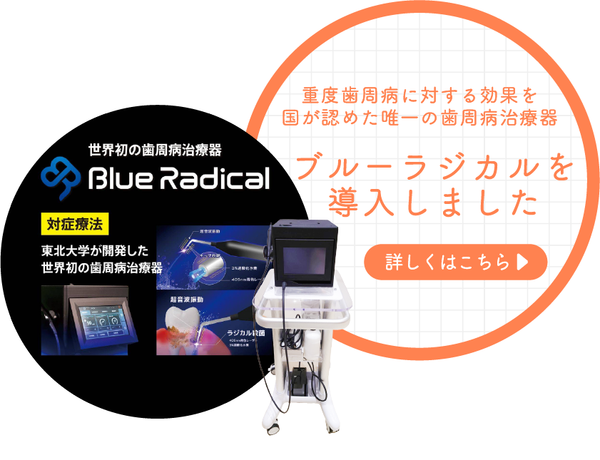 ブルーラジカルは、抜歯や外科手術なしで歯を守りながら治療を進めることができる、革新的な歯周病治療法です。痛みや体への負担が少なく、患者様にとって安心して治療を受けていただけることが大きな特徴です。
